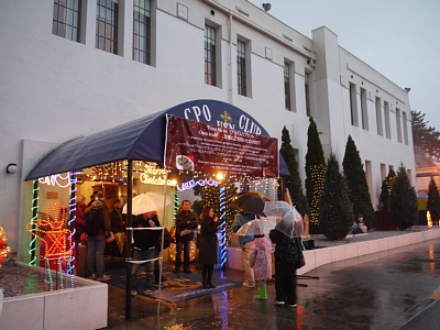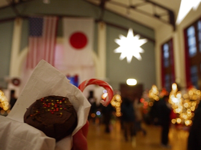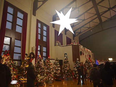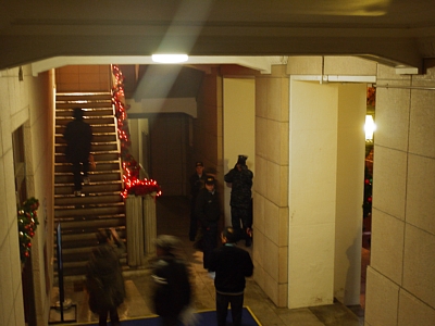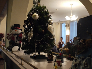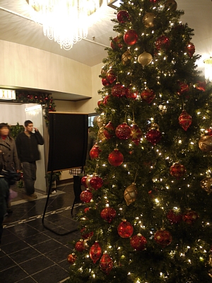 | 右はロビーにあったでっかいツリーです。食堂のほか、入って左側にはゲーセン(というかプールバー)やバーコーナーもあり。 |