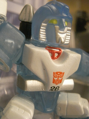 | 中身はオプティマスプライム、メガトロン(以上光沢塗料)、スカイワープ(stsc/サンクラの色替え)、クリフジャンパー(バンブルビーの色替え)、ミ ラージュ(クリアパーツ)。ジオラマ風のパッケージが可愛いのでまだ開けていません。っていうか正直あけるの面倒くさいです。 というわけでパッケージ越しですが、一番オリジナルと違う「ミラージュ(リジェ)」はこんな感じ。 |