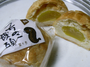 | 何故拘っていたかというとツチノコの形をしたグロ物体を想像していたからなので、意外と普通で拍子抜けw 中身は栗と小量の白餡。饅頭というよりパイ生地なので、和菓子好き・洋菓子好きの両方にウケそうな味です。普通に美味しい。5個入り630円から広島県府中市上下町各所で販売中。 |