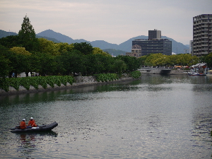| 元安川で警戒に当たる消防署の方、お疲れ様です。川の先、ビルの手前に原爆ドームがあります。15年振りくらいに見たけど何か綺麗になりましたね。補修した? |