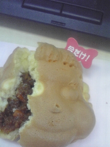 | 何スかこれ? 茶色いです。普通は餡子みたいなものを期待すると思うのですが、小さいけれど野菜みたいなものが見えています。 見た目・・・カレー?ってことは 甘く・・・ない? |