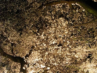 | 人も多いといえば多いけれど、週末の昼間ほどではないかな? 月曜日に雨も降りましたが、気温が上がらなかったせいかまだ殆ど散ってないもようです。 右上は「真上を見上げた図」。空が見えません! 今年の桜はなんだか長持ちしている気がします。 |