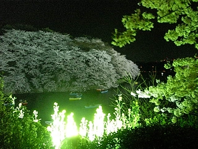 | いやお見事! 手前に映ってる人の頭と比べたら大きさが分かるでしょうか。とにかくデカイ!そしてよく咲いてる…! そのド派手なライトアップぶりは池の対岸に回りこんでみるとよく分かる。ちょっと桜が可哀想という気もしなくも無いですが、3月20日~30日までと短期間なので許して欲しいかも。 |