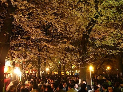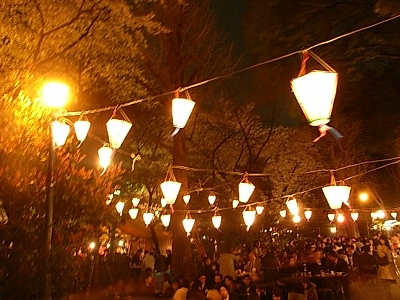 | ここも千鳥ヶ淵同様、宴会禁止なのでマッタリしていて良いです。飲みたい人は缶ビール片手に勝手に歩きながらチビチビやればよろし。厳密に言うと立ちビールもダメなんでしょうけど、羽目を外す人もいないので今のところ黙認してもらってる感じです。 ライトアップと言っても六義園や千鳥ヶ淵のような強めの白色灯ではなく、通常の街頭にプラスして提灯に点灯するだけなので、日が落ちると赤系の柔らかい夜桜になります。 |