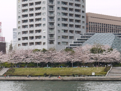 | 今回は公園内ではなく、少し月島寄りの堤防で勝手に花見してました。 良い所なんだけど、純粋に桜だけで前回書いた九段なんかと比べられてしまうと、少々辛い。 公園が出来て20年くらいなので、まだ木が若い感じがする。対岸の聖路加ガーデン(右下)などがもっと育ってくれれば、かなり見ごたえありだとは思うんだけど。 |