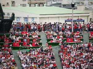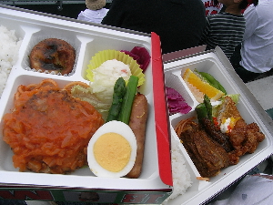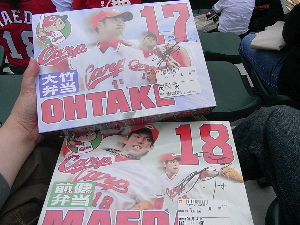 | 焼き肉パーティ席、ゴロ寝席からタダ見エリアまで、いろんな券種がウリですが今回は3塁側「スカイシート」を選択。 下段は本人プロデュースによる、前田(健)弁当&大竹弁当。ハンバーグとタコ焼…前田の味覚が子供過ぎるw 「たこ焼をおかずに白米」という、関東人にあるまじき行為を強制させられて少々屈辱感を味わいつつもプレイボールを待ちます。 |