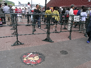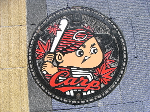 | というわけで出来たばっかりの新生・市民球場に突入。下りの新幹線では減速中に球場内がよく見えるので、通りすがりの方も是非覗いて見てください。ネットでのチケット購入もでき、遠方から旅行や帰省で来る人も観戦しやすくなりました。 球場周辺のマンホールが全部「カープ坊や」。踏まれちゃうけど良いのだろうか。 |