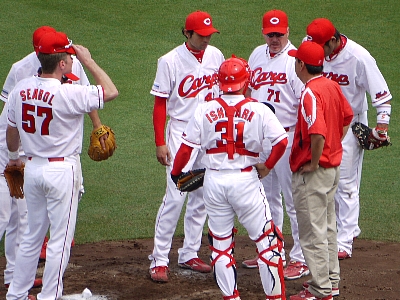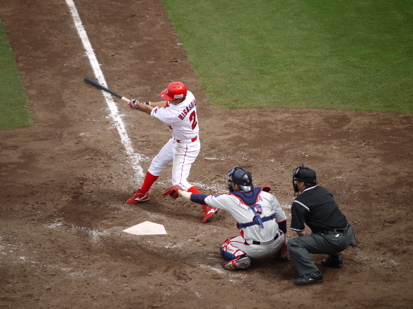 で、カープの応援なのに何故3塁側にいるかというと、一番見たいのが監督のマーティ・ブラウンだからです。試合中の半分はベンチ見てましたがネット越しになってしまうのがやや残念。