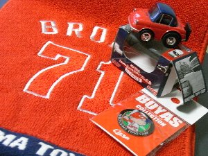 | というわけで戦利品でありますv ブラウンTシャツは「グッズ付きチケット」の景品にしかなくてゲットできませんでした。 根本的にブラウングッズが少なすぎる。選手だけじゃなくて監督のミニフィギュアも出してくれ。ポーズは勿論「ホームベース投げ」で。 チョロQはマツダZoom-Zoomスタジアムオープン記念品の「R360クーペ」。 |