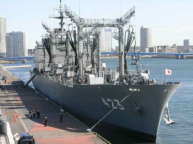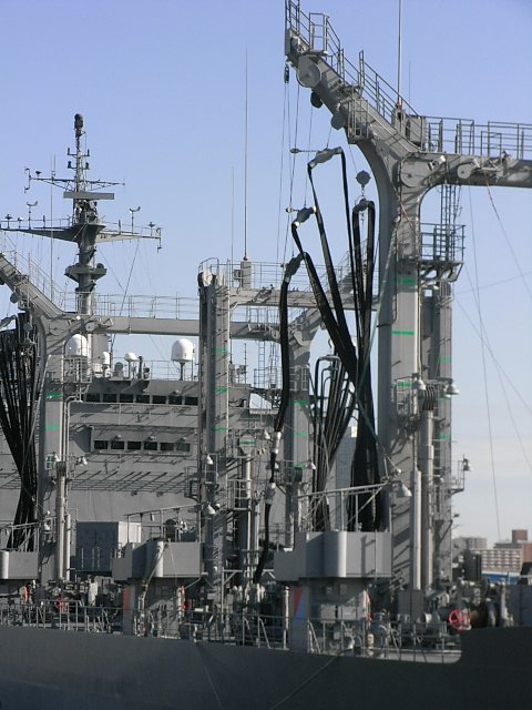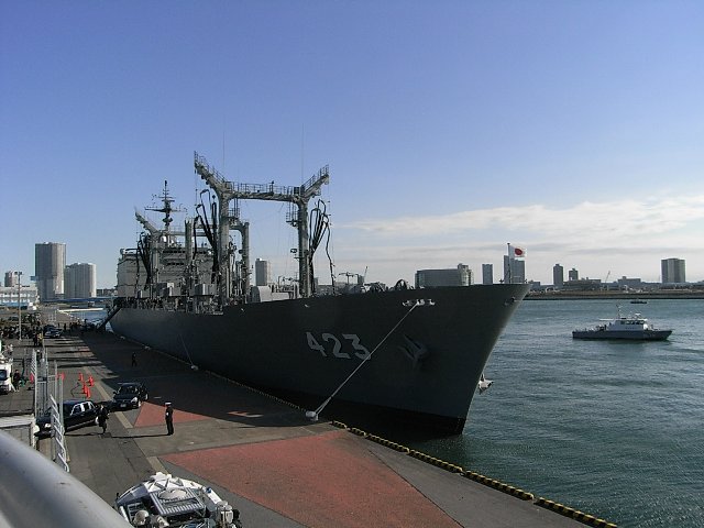 どの辺が補給艦?という方の為に、装備のUPを。このぶっといパイプあたりで見分けてくだされ。サポートする船の大型化に伴い、補給艦も大きめの子が望まれています。(それで出来たのが「ましゅう」型。)