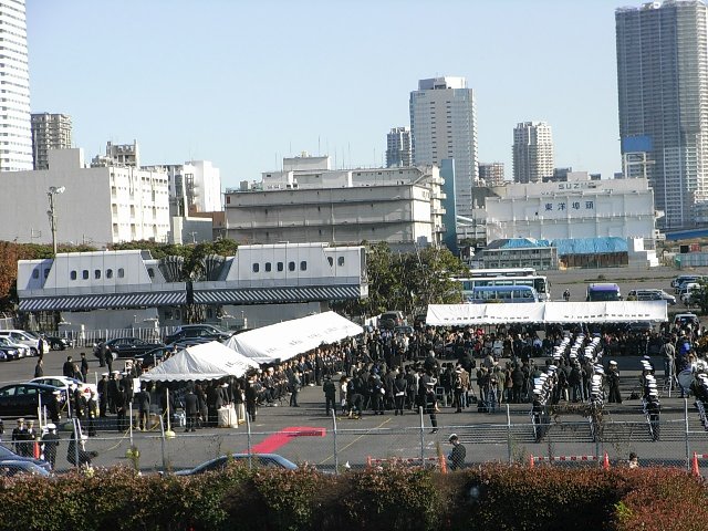 VIPが来てるので、陸路は警視庁、湾内は海上保安庁の巡視艇たちがガッチリ固めてます。右にいる小さめのフネが海保の巡視艇 CL19「ゆりかぜ」。地上はゾロゾロ帰ってゆくVIPカー。国旗立てた車もいる。…写ってないけどパジェロに(外)ナンバーってどこの国だ。趣味で公用車買ってないか?w