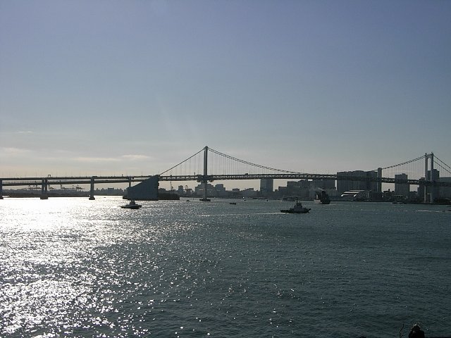 上の写真がすっかり影になってて悲惨なんですが、もう日焼けするよ!ってくらいの逆光だったので…。東京湾っていつも混んでるから、すぐに他の船にまぎれて分からなくなっちゃいます。ちょい右よりで煙吹いてるのが「ときわ」。先にあるはレインボーブリッジ。左側は有明まで一気に見通せるくらい開けてるので、東京とはいえ開放感のあるところです。
