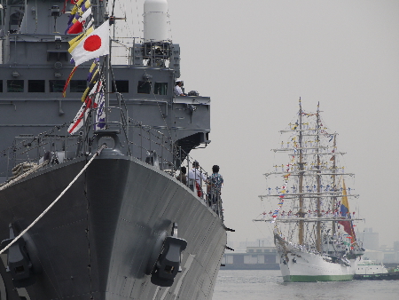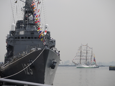 | 横浜新港の南側から入ってくる「グロリア」。前日に入港済みのホストシップDD-123「しらゆき」とツーショット。(うわぁヤバイ、しらゆきカッコイイ・・・!もう日本の護衛艦のカッコよさは異常。ルックス重視で設計してるんじゃないかと思うくらい。) |