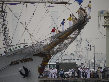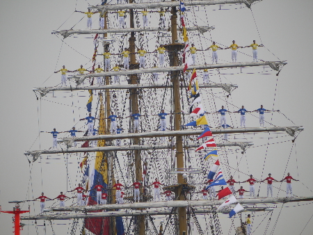 | またもヤードに人が! 帆船の最高儀礼だそうです。「クアウテモック」と同様に生歌付き。こちらは伴奏がなく、完全アカペラなのでラテンっぽさには欠けますが、生歌ならではの迫力があって感動的です。 クアウテモックが全員オレンジの作業服だったのに比べて、こちらは黄、青、赤のカラフルな3色。これってコロンビア国旗と同じ色ですね!いいなぁー。 |