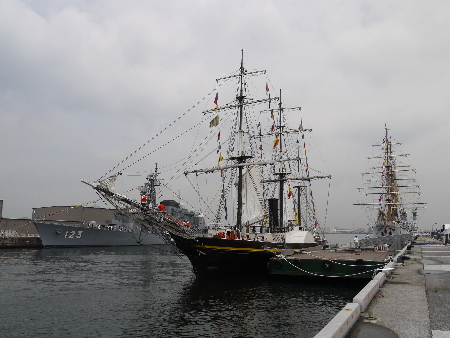 | お疲れさまー! 付き添いの海保PL-50「はまかぜ」もおつかれさまです。 下は有料で公開していた観光丸(ハウステンボスから出張、黒船っていうけど今見ると小さくて可愛い)と「グロリア」、「しらゆき」を一緒に。 手前には横浜税関 の「みょうこう」もいました。名前だけ聞くとイージス艦みたいで凄そうですが、税関の方のみょうこうはいっそ釣り船みたいな普通のフネですw |
