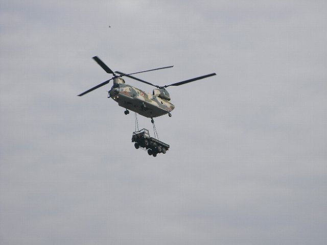 ↓立ちつくしたまま見た午前中の飛行展示より。CH-47J(チヌーク)名物・「トラック誘拐デモ」w