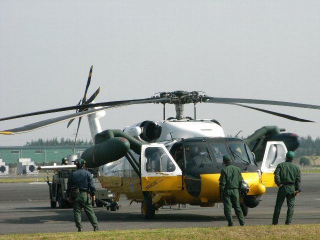 給油、充電も終わって牽引されて行く、救難カラーの黒鷹さん。牽引するときはいわゆる「尻尾」から引きずられて行くのがまたかわいいー。