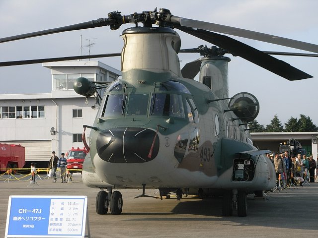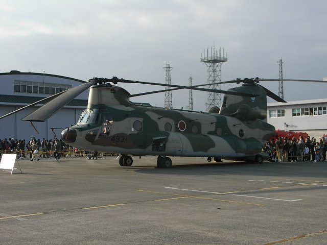 メインローターが2つあるのが特徴、大規模災害の被災地なんかにもよく出かけてるやつですね。55人乗れるけど、居住性はゼロに近い…らしい。このまま旋回すると、トラックがおもいっきり振り回されてて結構かわいそうです。