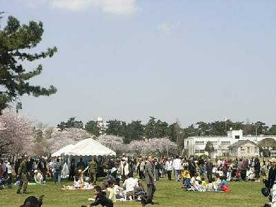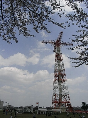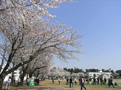 落下傘訓練塔広ーい! 桜いっぱーい!桜も吹雪き始めたばかりという感じでコンディション最高ー! 広い上に周りに高い建物がないから、空が大きくて凄く気持ち良いよね、ここ。天候もほぼ快晴・微風という絶好の降下日和w、気温も高めだし上着要らないな。脱いじゃお。