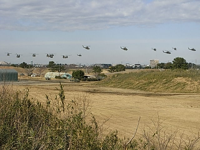前回の続き。すみません上ばっかり見ていたせいで、主力のはずの地上部隊のことはあんまり…。でもどうせ地形の関係で、一般客のいる土手からは敵役が見えないのです。上空からいろいろ撒いたり、空砲撃ったりしてるのは見えるんですけど。何度も左手(航空部隊が進入してくる方)を振り返っていた自分に釣られて後ろを見てしまった周りの人たち、自分のせいで地上の美味しいものを見逃してたらスミマセン。