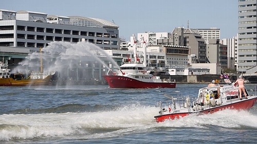 救助デモの終了と同時に、「みやこどり」による放水デモを開始。これを見るだけだと少々ショボイのですが、風向きによっては見学客に水がかぶるので、この日はかなり自重しているとのこと。本当はもっと遠くまで放水できます。