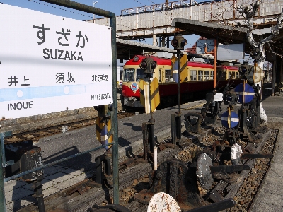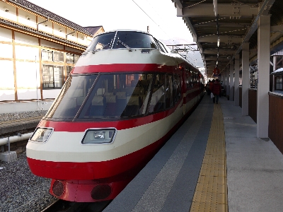 | 昔の小田急ロマンスカーの車両が、長野電鉄で特急として活躍中。懐かしいな~。 須坂の乗り換えって何であんなに接続が悪いんだろう…。退役済みのレールや信号が、ホームの片隅にオブジェっぽく固めてあるのが不思議な駅。 |