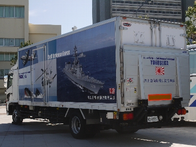 移動用トラックを発見。ダサカッコイイw 写真に使われているのはDD-107「いかづち」、遠くに「きりしま」もいるよ |