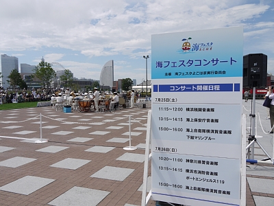 象の鼻?のあたりで制服バンドのライヴもやってる。クリックで看板拡大。このときは海保バンドがやってました 1日目:横浜関税、海保、海自。 2日目:神奈川県警、消防、海自 |