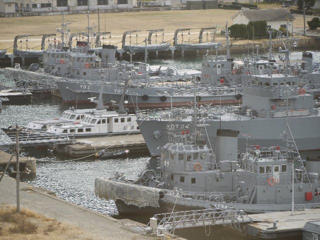 | 展望台からは東側にある海自の一部も見えたよ。 YT(タグボート)、YO(油船)、YDT(水中処分船)など、種類だけならすごい数。裏方部隊で普段、一般客が見る機会があるのは曳船くらいだと思うので、ある意味貴重かも。 |