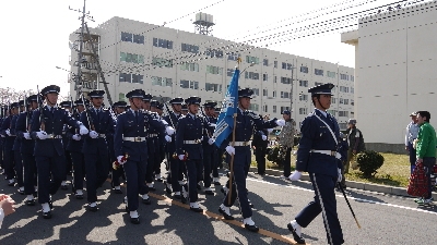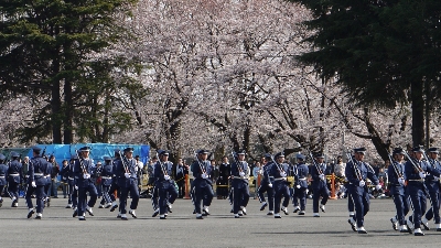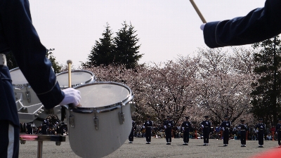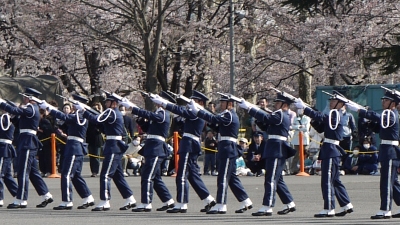 というわけで午後2回のドリル演技を見てきました。出演は熊谷基地にある「高校の勉強をしながら給料が貰えて仕事も覚えられるところ」の人たち。満開の桜の下で見るドリル演技は綺麗だけど、ちょっと迫力に欠ける気がするのは本職じゃなくて学生さんだから? でもオリジナル曲はシンバル押さえめ、ちょっとプリミティブで良い感じです。