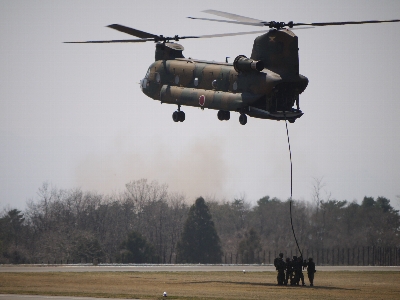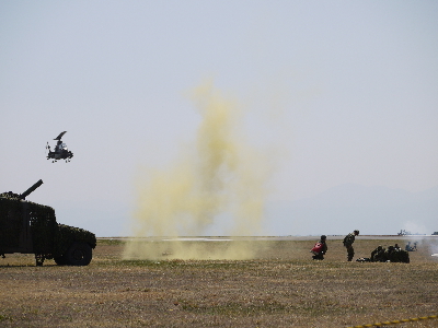 | 正面側が満席なので、敵部隊役側で見ていたら逆光になってしまった…。でもいつもと違う視点で見られて面白かったかも。ヘリボーン大好き! ものすごい原野みたいに広く見えますが、高台にあるからそう見えるだけで、実際にはごく普通の演習場(+飛行場)です。 |