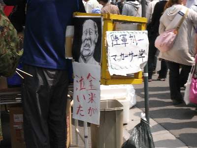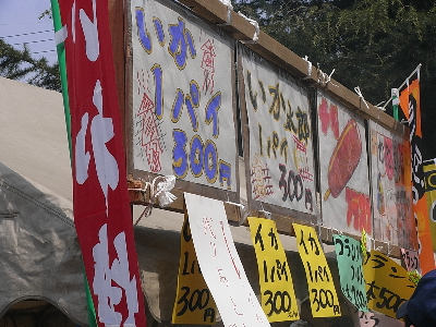 | ここの模擬店も中の人がやってるので、結構安い。イカ買ったよー。 右の看板は・・・? |