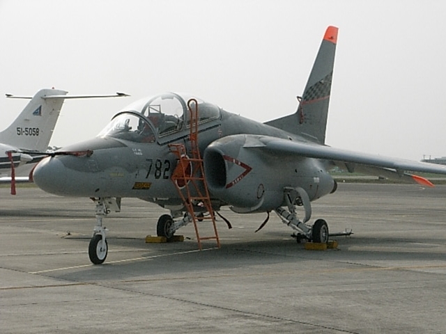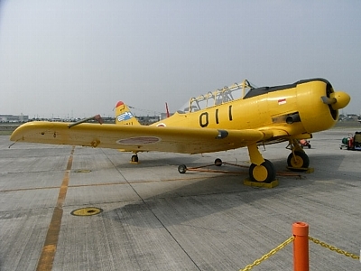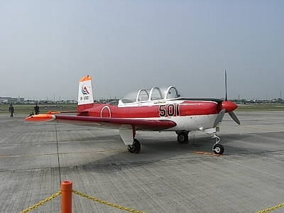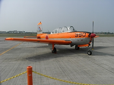 | 練習機てんこもり。 もう引退したT-6(黄色いの)、T-34(オレンジの)。T-3(紅白の)は去年退役。 T-4(右下、BIも使ってる)は浜松にたくさんいるけど、この日のメインはT-7(後述)かなぁ。 |