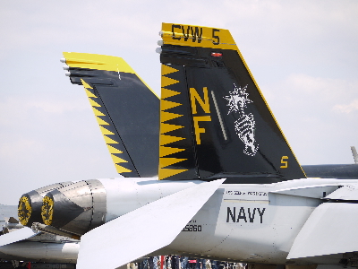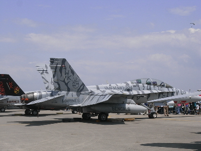 | 昼休みの隙を突いて地上展示巡り…のはずが、そもそも予定なんてあってないみたいにgdgdなので、まだ全部回っていないのに空挺団の降下デモが始まってしまったりなどなど散々な目に。それでも海自のおNEWな顔ぶれをメインに見てきたよ。 画像はF/A-18(ロイヤルメイセズ)のおなか。 |