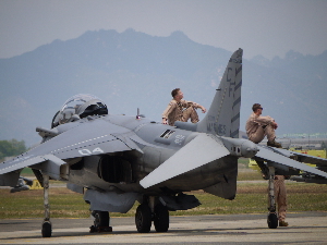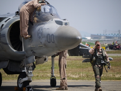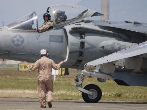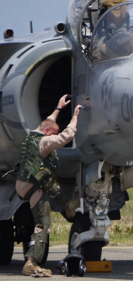 | 今回一番気に入りの1枚のひとつがこれ。 ハリアーに乗る時は (1)左足:引きおろし式のステップ (2)右足:胴体から立てるステップ(Pさんの脇の高さあたり、ちょっと右側に見えてる) (3)左足:エアインテーク (4)右足:画像で右手がかかっているステップ ……という順番なわけですね。いつか役に立つかも知れないから覚えておこう。 ※因みにF/A-18は左の翼の下からガバッ!とラダーが出てきたのを見たことあり。豪快 2009年岩国FSDに関する過去記事index