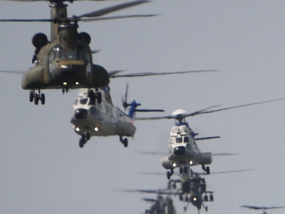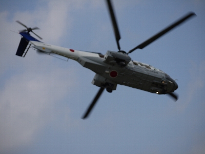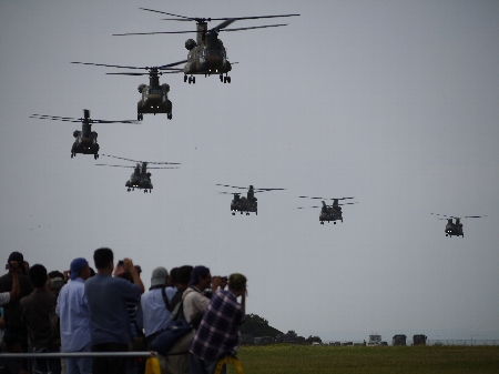 | CH-47Jみたいな大きな機体がめちゃくちゃ近くを通ってくれるので、そりゃもう凄いことになってます。下は三脚を薙ぎ倒されるギャラリーw 自分は来賓席寄りの安全地帯にいたので無事でした。 |