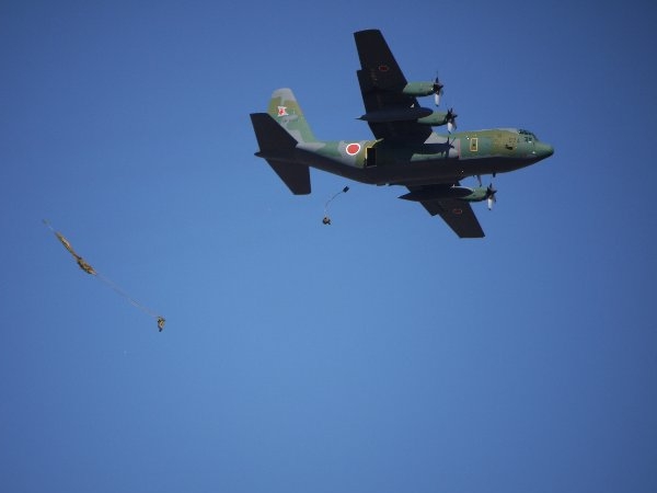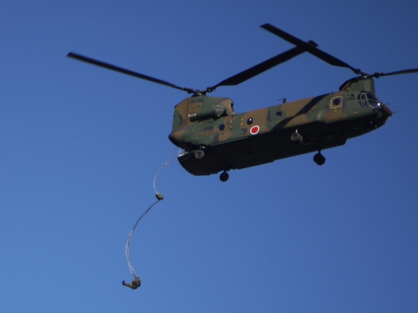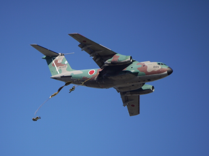 ・・・と、そんな飛びものたちがが次々に現れてはもう降下降下降下降下降下降下、面白いくらい落ちるわ落ちるわ、怒涛の落下傘落ちを披露してくれました。カウントダウンと「降下」の号令は客に聴こえるようにスピーカーで流してくれるので、降下開始の瞬間を見逃すことはありません。うっかりひとつ見逃しても、すぐに次のが来るので安心ですw 因みにBGMの一部は「空の神兵」だったと記憶。おそらくアニソン大会になるであろう空自と違って硬いなぁ。