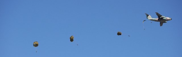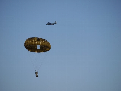 | 左は普通の。(後ろにC-130がいます) 高高度から降りるときは四角いパラ(右)。こっちの方がコントロールしやすいそうです。…と聞いた気がしますが違っていたらスマン。 |