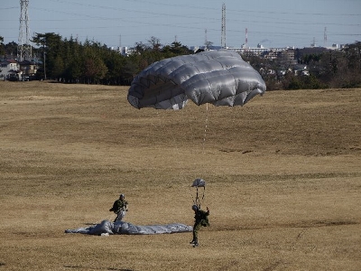 強風のため縮小気味だった去年と違って、いい感じの降下日和かも!ということで今年も行って来た。内容はエアボーン中心の模擬戦(+防衛大臣も来る)場所は習志野ですが、駐屯地じゃなくて演習場の方であることに注意。 [追記→(2)(3)]