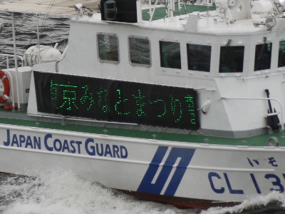 ※左上は周囲で警戒中の海保CL135「いそぎく」。終わったあとは「海保ブースに来てね!うみまる君もいるよ」と電光掲示板でアピールしまくり。