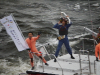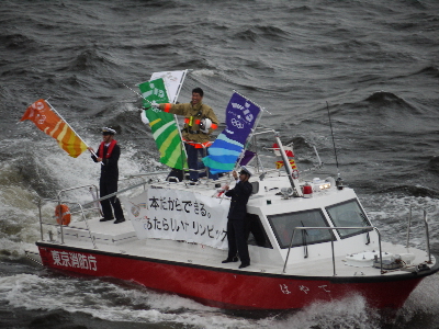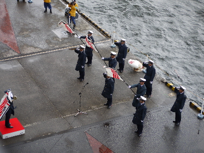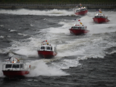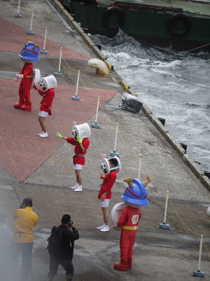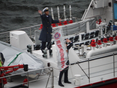 早朝からの大雨は上がったものの、かなりの強風でいつ嵐になってもおかしくない空気。開始5分前でも3F送迎デッキには一般客が8人しかいないという余裕っぷりなので※、フネやヘリコ好きの方には、競争率の高い有明の出初式よりも絶対にオススメ。有明より近くで見られますしね。