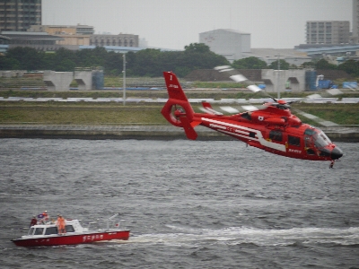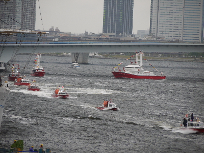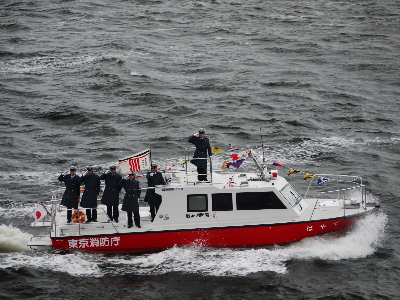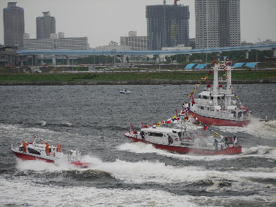 内容は東京消防庁の消防艇、消防ヘリによる観閲や救難デモ。東京消防庁音楽隊もBGMで盛り上げてくれる。消防艇は4/16に予行で見かけたもの+日本橋消防署の「すみだ」の9艇。ヘリコはお馴染み「はくちょう」「ちどり」「かもめ」の3機が参加。
