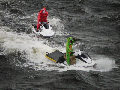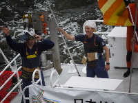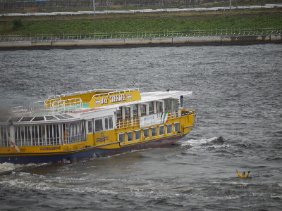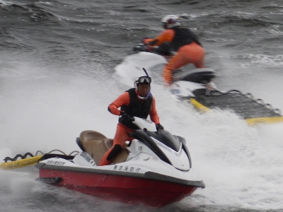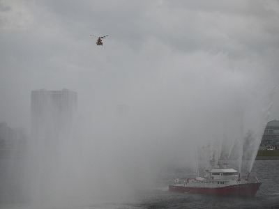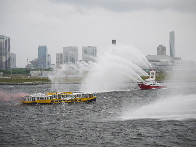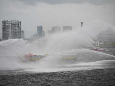 | 水上バスが激しく炎上中!という想定で放水…は良いのですが放水が激しすぎて何も見えないw 確かに水だけはいくらでもあるもんね。 | ||
