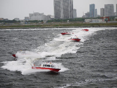 | 高速艇たちにも見せ場あり。一列で直進→左右に散開、とかいろいろ。この機動性は競艇みたいだといつも思います。 | ||