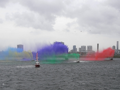 | これが出るとそろそろフィナーレ。今年の五色放水、テーマは東京オリンピック2016だそうです。ン~?正直「そうかなぁ?」みたいなw | ||
