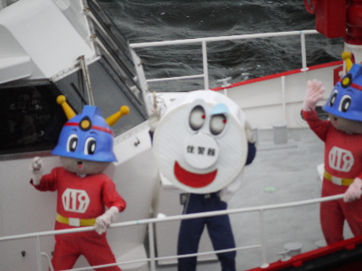 | そして「すみだ」には二人のキュータ君と「家庭内火災報知器くん」が…! インターバルの間、自作っぽい歌(ピアノ伴奏つき)とダンスで家庭内報知器の普及をアピールしていましたがここにまで出張って来るとは仕事熱心なやつめ。 |