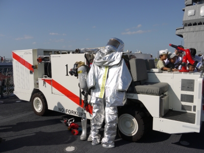 | 艦載救難作業車、という名ですが要は消防車? 化学薬品満載だけに大変そうですが、防護服がなんか漫画チックで緊張感に欠ける絵柄であるというw |