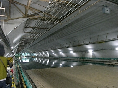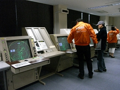 | 左上、ENRI内の航空管制シミュレータ。もうニヤニヤしちゃうvv 本物の稼働中には近付けないのでこれで我慢w 但しデータは民間機ばっかりで、小牧や静浜の子がいないのが寂しいです(´・ω・`) 右上はNMRI内の400m水槽。船が受ける水の抵抗を調べている。奥まで案内してくれるけど、ほぼ凪ってる時の実験しか再現してくれないので、パーフェクトストーム状態みたいのを期待するとガッカリしますw |