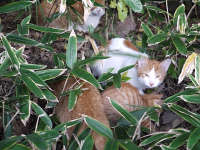 | 久し振りに見ました、猫の集団保育。 子猫が7~8匹いて、大きさが皆違うので、一腹の子だけじゃないですね。一族の子猫をみんなで育てているもようです。 |