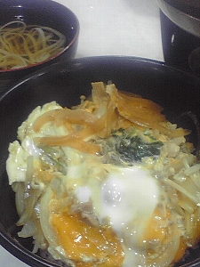 | 同じ敷地内に比内鶏(天然記念物)がいたので、昼ごはんは比内地鶏親子丼にしました…。一人前の鍋に入ってくるので、自分で調理してご飯に乗っけたところ。ご馳走様でした。 |
